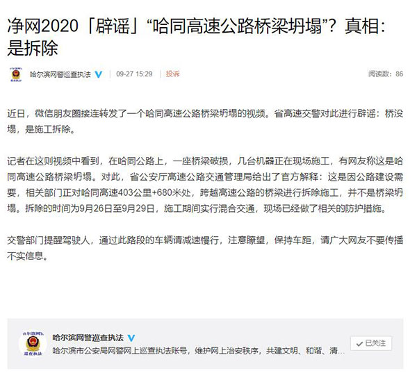 近日,微信朋友圈接連轉(zhuǎn)發(fā)了一個(gè)哈同高速公路橋梁坍塌的視頻。省高速交警對此進(jìn)行辟謠:橋沒塌,是施工拆除。
