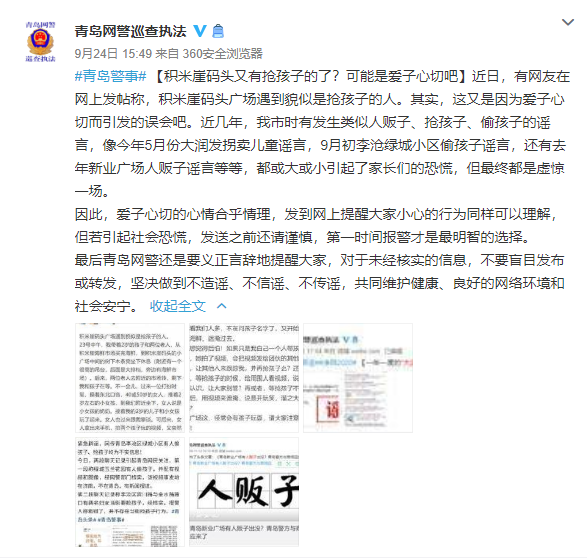 9月24日下午,青島網(wǎng)警官方賬號(hào)發(fā)布辟謠信息。近日,有網(wǎng)友在網(wǎng)上發(fā)帖稱,積米崖碼頭廣場(chǎng)遇到貌似是搶孩子的人。其實(shí),這又是因?yàn)閻圩有那卸l(fā)的誤會(huì)吧。近幾年,青島市時(shí)有發(fā)生類似人販子、搶孩子、偷孩子的謠言,像今年5月份大潤(rùn)發(fā)拐賣兒童謠言,9月初李滄綠城小區(qū)偷孩子謠言,還有去年新業(yè)廣場(chǎng)人販子謠言等等,都或大或小引起了家長(zhǎng)們的恐慌,但最終都是虛驚一場(chǎng)。
