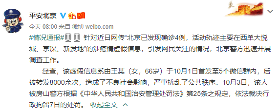 10月4日,北京市公安局在其官方微博發(fā)布情況通報,通報全文如下:針對近日網(wǎng)傳“北京已發(fā)現(xiàn)確診4例,活動軌跡主要在西單大悅城、京深、新發(fā)地”的涉疫情虛假信息,引發(fā)網(wǎng)民關(guān)注的情況,北京警方迅速開展調(diào)查工作。經(jīng)查,該虛假信息系由王某(女,66歲)于10月1日首發(fā)至5個微信群內(nèi),后被轉(zhuǎn)發(fā)8000余次,造成了不良社會影響,嚴(yán)重擾亂了公共秩序。10月3日,該人被房山警方根據(jù)《中華人民共和國治安管理處罰法》第25條之規(guī)定,依法裁決行政拘留7日的處罰。