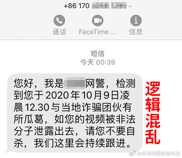 據(jù)云南網(wǎng)警巡查執(zhí)法官方微博消息,近日,有網(wǎng)民舉報(bào)稱,自己收到了一條自稱是“網(wǎng)警”發(fā)來的警告短信,聲稱自己與詐騙團(tuán)伙“有所瓜葛”。
