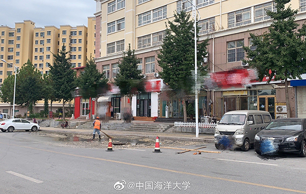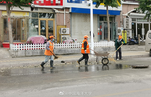 工作人員正在現(xiàn)場清理。圖片來源:中國海洋大學(xué)官方微博