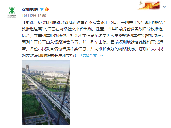 12日早間,網(wǎng)傳“深圳地鐵6號(hào)線因脫軌導(dǎo)致推遲運(yùn)營”。據(jù)深圳地鐵官方微博消息,地鐵6號(hào)線因設(shè)備故障導(dǎo)致推遲運(yùn)營,并非列車脫軌所致。網(wǎng)傳配圖實(shí)為6號(hào)線列車連掛救援過程,兩列車正位于出入場(chǎng)段道岔位置,并非出軌。
