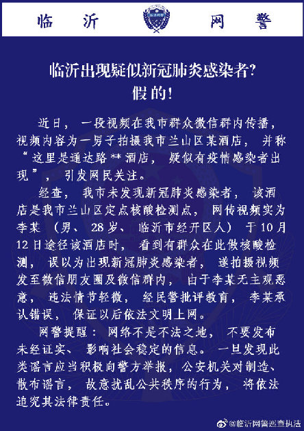 通報(bào)提到,該酒店是定點(diǎn)核酸檢測點(diǎn),網(wǎng)傳視頻實(shí)為李某(男,28歲,臨沂市經(jīng)開區(qū)人)于10月12日途徑該酒店,看到有群眾在此做核酸檢測,誤以為出現(xiàn)新冠肺炎感染者,遂拍攝視頻發(fā)至微信朋友圈及微信群內(nèi),由于李某無主觀惡意,違法情節(jié)輕微,經(jīng)民警批評(píng)教育,李某承認(rèn)錯(cuò)誤,保證以后依法文明上網(wǎng)。