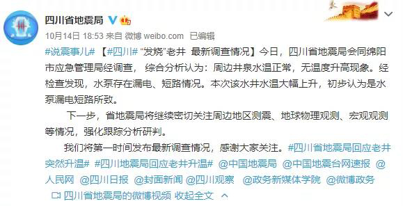 14日18時(shí)許,四川省地震局官方微博回應(yīng)此事稱,該水井水溫大幅上升,初步認(rèn)為是水泵漏電短路所致。下一步,省地震局將繼續(xù)密切關(guān)注周邊地區(qū)測震、地球物理觀測、宏觀觀測等情況,強(qiáng)化跟蹤分析研判。