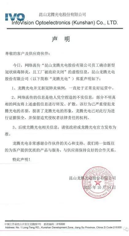 與此同時,網(wǎng)上還傳出“昆山龍騰光電股份有限公司有員工確診,且工廠被政府關(guān)閉”的消息。10月14日,龍騰光電就此不實(shí)消息官方辟謠:龍騰光電并無新冠肺炎感染者,一直處于正常良好運(yùn)營中。(作者:白璐)