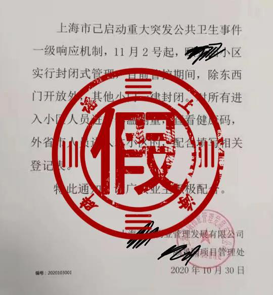 近日,上海某小區(qū)的一張通知在微信群里流傳。通知上稱,“上海市已啟動重大突發(fā)公共衛(wèi)生事件一級響應(yīng)”,“11月2號起,小區(qū)實行封閉式管理,除東西門開放外,其他小門一律封閉。對所有進(jìn)入小區(qū)人員進(jìn)行體溫測量,查看健康碼,外省市人員進(jìn)入本小區(qū)的,配合填寫相關(guān)登記表?!甭淇钍窃撔^(qū)的物業(yè)管理公司,時間為2020年10月30日。
