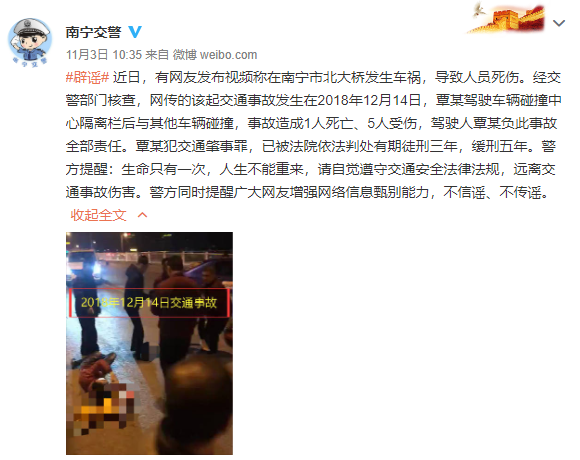 經(jīng)@南寧交警 核查,網(wǎng)傳的該起交通事故發(fā)生在2018年12月14日,覃某駕駛車輛碰撞中心隔離欄后與其他車輛碰撞,事故造成1人死亡、5人受傷,駕駛?cè)笋池摯耸鹿嗜控熑巍q撤附煌ㄕ厥伦?,已被法院依法判處有期徒刑三年,緩刑五年?網(wǎng)警提醒: