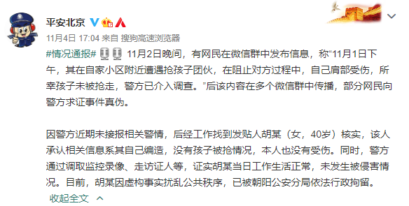因警方近期未接報(bào)相關(guān)警情,后經(jīng)工作找到發(fā)貼人胡某(女,40歲)核實(shí),該人承認(rèn)相關(guān)信息系其自己編造,沒有孩子被搶情況,本人也沒有受傷。同時(shí),警方通過調(diào)取監(jiān)控錄像、走訪證人等,證實(shí)胡某當(dāng)日工作生活正常,未發(fā)生被侵害情況。目前,胡某因虛構(gòu)事實(shí)擾亂公共秩序,已被朝陽公安分局依法行政拘留。