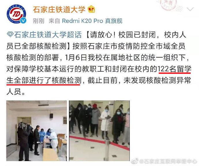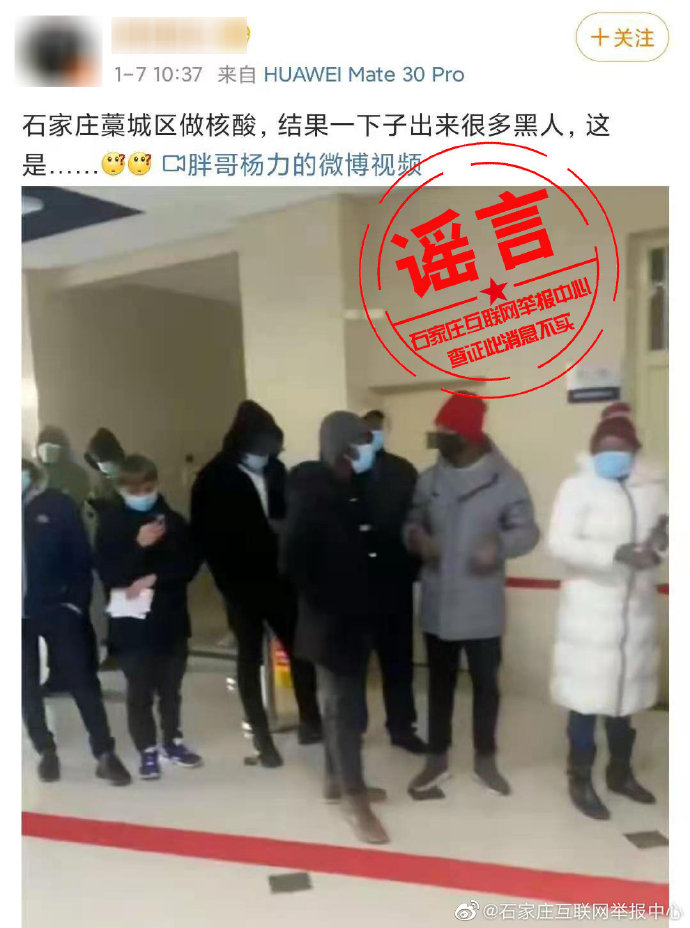 近日,微信、微博等平臺(tái)流傳 “藁城區(qū)有外國人聚集做核酸檢測(cè)”的視頻、圖片信息。經(jīng)石家莊互聯(lián)網(wǎng)舉報(bào)中心向藁城區(qū)相關(guān)部門核實(shí),事發(fā)地不在藁城,藁城區(qū)也無涉外高校。經(jīng)向石家莊鐵道大學(xué)了解,網(wǎng)傳信息為1月6日該校按全市防疫工作要求組織外國留學(xué)生進(jìn)行核酸檢測(cè)的場(chǎng)景。
