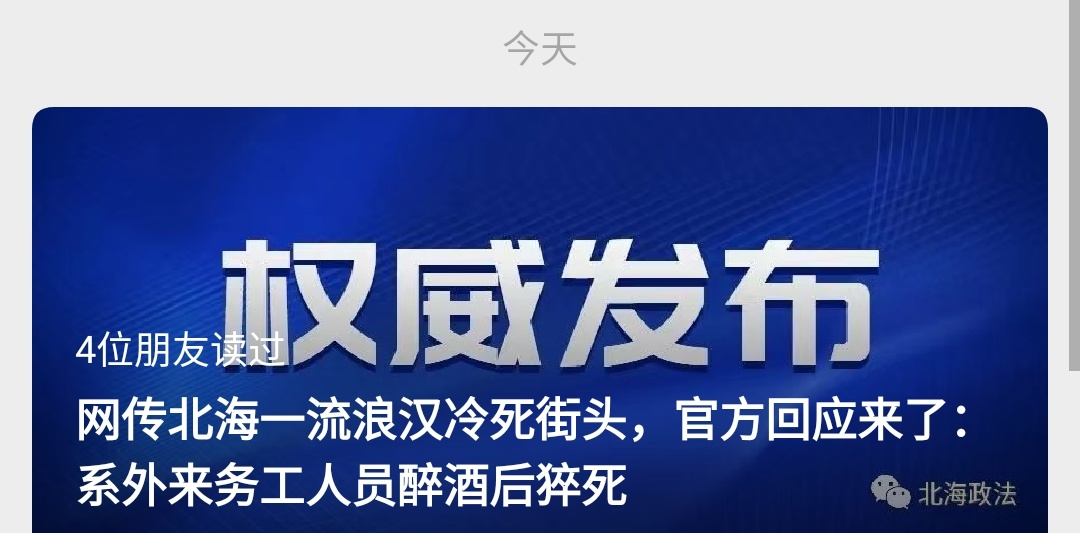 2020年12月31日晚,廣西北海市本地微信公眾號出現(xiàn)文章:稱北海市2020年12月31日凌晨有一名流浪乞討人員被冷死街頭。發(fā)現(xiàn)該情況后,北海市委政法委高度重視,協(xié)調(diào)多個部門進行核查。