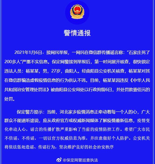 2021年1月6日,接網(wǎng)民舉報,一網(wǎng)民在微信群傳播謠言稱:“石家莊死了200多人“嚴(yán)重不實信息。保定網(wǎng)警接到舉報后,第一時間展開核查,很快鎖定違法人員:楊某某,男,27歲,曲陽人。經(jīng)曲陽縣公安機關(guān)核查,楊某某對其在微信群編造虛假疫情信息的行為供認(rèn)不諱。目前,楊某某因違反《中華人民共和國治安管理處罰法》被曲陽縣公安局處以行政拘留6日,并處罰款壹佰元的處罰。