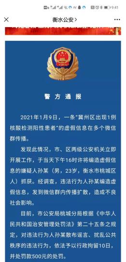發(fā)現(xiàn)此情況,衡水市、區(qū)兩級公安機關立即開展工作,于當天16時許將編造虛假信息的嫌疑人孫某(男,23歲,衡水市桃城區(qū)人)抓獲。經(jīng)調查,違法行為人孫某編造虛假信息,發(fā)到微信群內傳播擴散,造成不良社會影響。