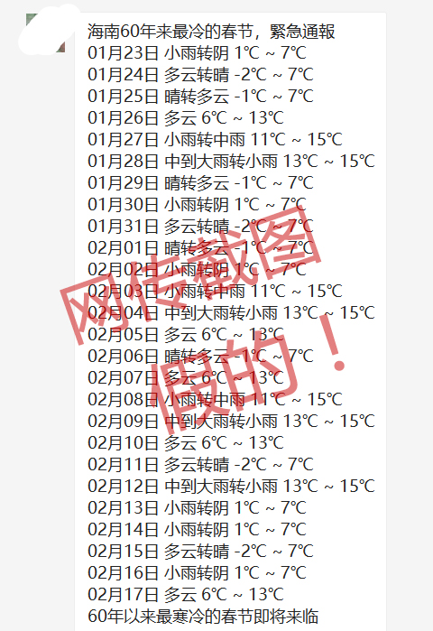 近日,微信群朋友圈傳播著一張“海南60年來最冷的春節(jié),緊急通報”的截圖。記者從海南省氣象局了解到,省氣象部門從未發(fā)布過此消息,該傳言為不實言論。