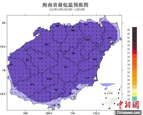 本次強冷空氣影響如何,海南是否會下雪?海南省氣象臺張春花副臺長介紹,受強冷空氣影響,1月7日8時至12日8時,海南島全島18個市縣共有198個鄉(xiāng)鎮(zhèn)(區(qū))最低溫度低于10℃,其中,五指山、瓊中、屯昌、儋州、白沙、澄邁、定安、臨高、??凇⒉?、文昌、瓊海和萬寧13個市縣共有100個鄉(xiāng)鎮(zhèn)(區(qū))最低溫度低于7℃,五指山、瓊中、屯昌和儋州4個市縣共有8個鄉(xiāng)鎮(zhèn)(區(qū))最低溫度低于5℃,最低為五指山市阿陀嶺0.6℃。