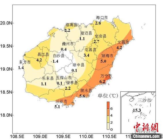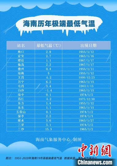 根據(jù)海南省國家氣象觀測站的歷史資料統(tǒng)計,海南島各地年極端最低氣溫在-1.4~6.2℃之間,呈中間低四周高的分布,北部低于南部。以白沙最低,為-1.4℃(1963年1月15日),五指山和瓊中次低為0.1℃(1974年1月2日),儋州出現(xiàn)過0.4℃(1955年1月11日);東南部的萬寧較高,為6.2℃(1963年1月15日);昌江、屯昌、文昌、三亞和陵水等地3.0~6.0℃;其余地區(qū)為1.0~3.0℃。永興島年極端最低氣溫達15.3℃。除昌江和文昌的年極端最低氣溫出現(xiàn)在12月外,其余地區(qū)均出現(xiàn)在1月。