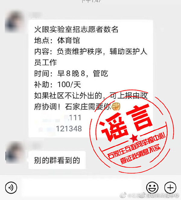近日,網(wǎng)絡(luò)流傳“河北‘火眼’實(shí)驗(yàn)室招聘數(shù)名志愿者,負(fù)責(zé)維護(hù)秩序,輔助醫(yī)護(hù)人員工作,管吃還每天補(bǔ)貼100元”的信息。經(jīng)石家莊互聯(lián)網(wǎng)舉報(bào)中心向河北“火眼”實(shí)驗(yàn)室相關(guān)工作人員核實(shí),該消息為謠言,目前河北“火眼”實(shí)驗(yàn)室還沒(méi)有招聘志愿者計(jì)劃。