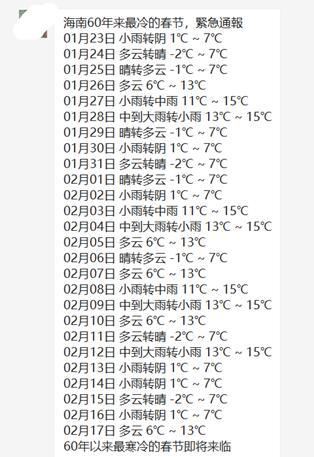 多個微信群、朋友圈流傳著一張“海南60年來最冷的春節(jié)”截圖