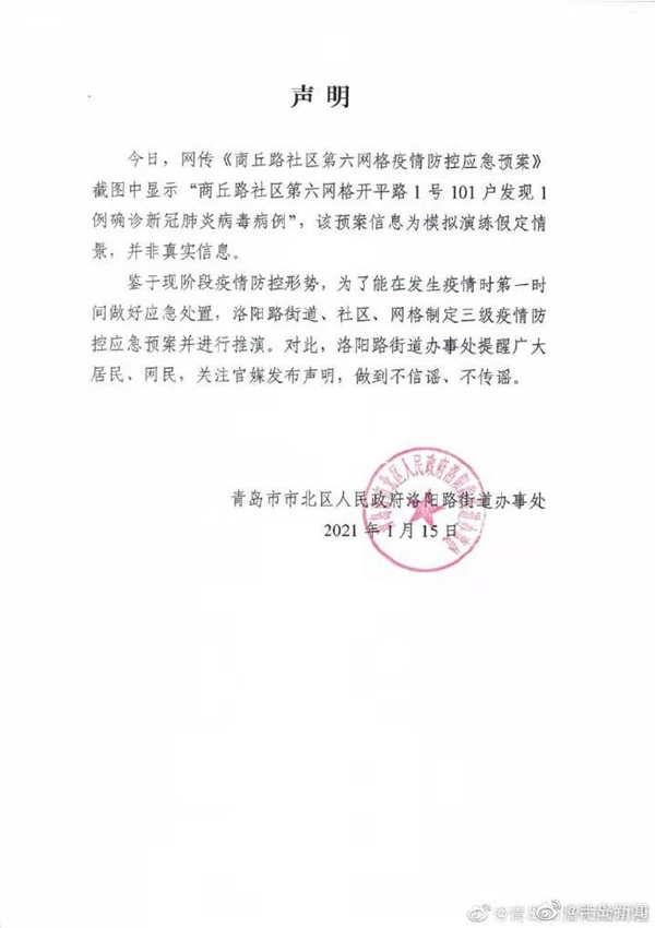 對(duì)此,青島市北區(qū)洛陽(yáng)路街道辦事處回應(yīng)稱,該預(yù)案信息為模擬演練假定情景,并非真實(shí)信息。洛陽(yáng)路街道辦事處提醒市民和廣大網(wǎng)友及時(shí)關(guān)注官媒發(fā)布聲明,做到不信謠、不傳謠。