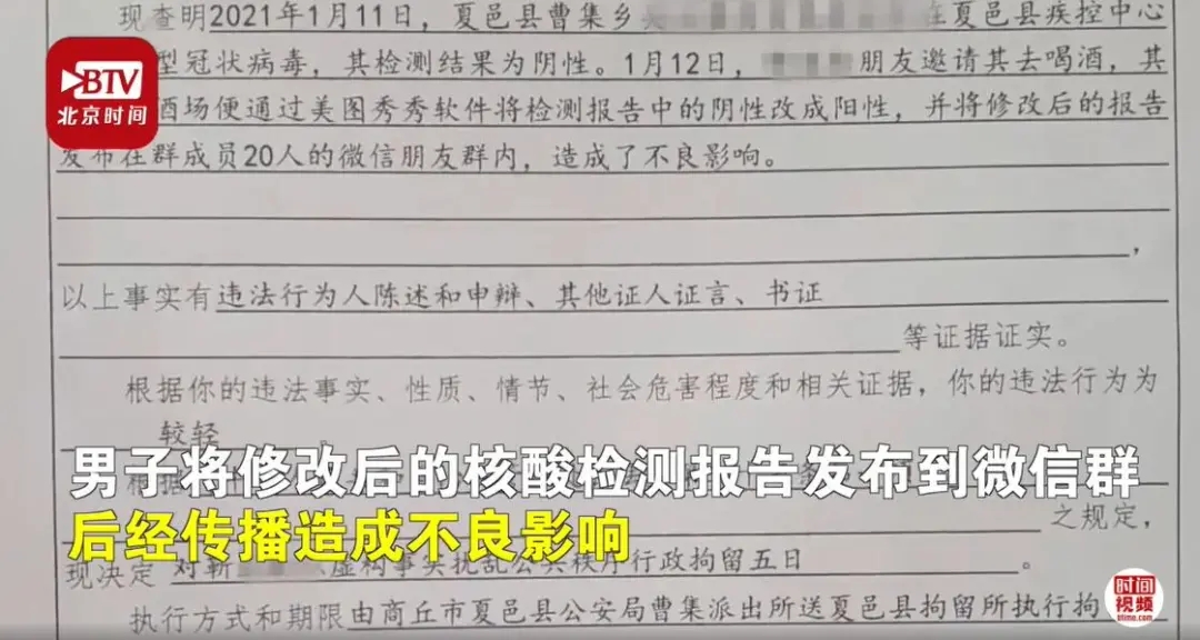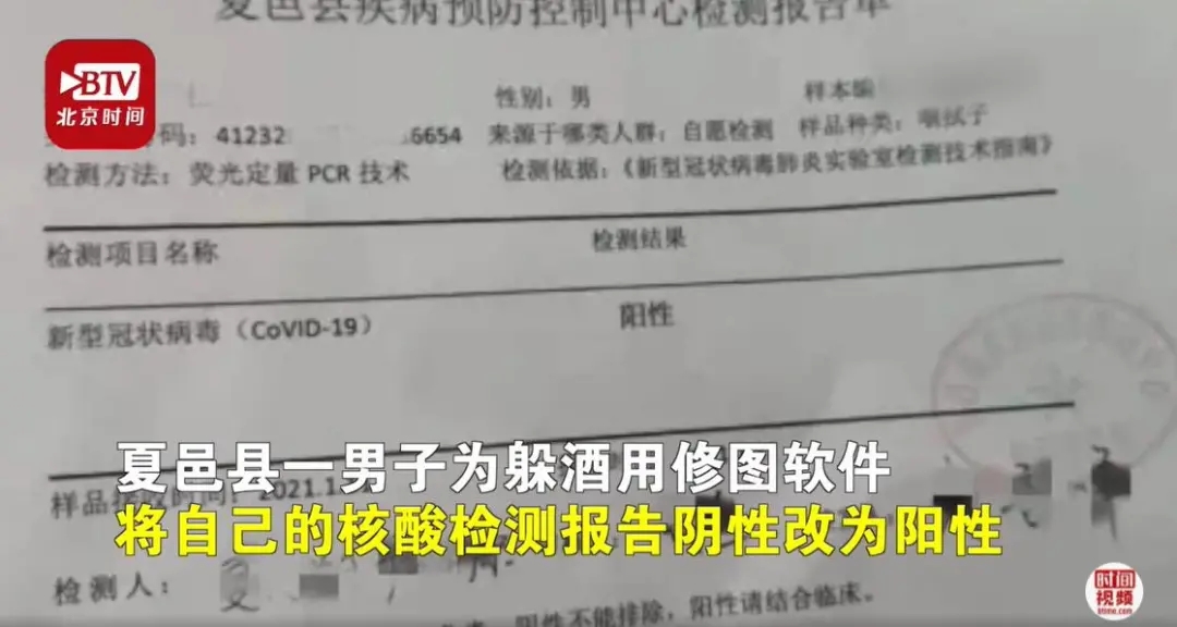 2021年1月11日,河南省商丘市夏邑縣一男子為躲酒局,用修圖軟件將自己的核酸檢測報告陰性改為陽性并發(fā)布到微信群,造成不良影響。男子稱,直接拒絕怕失面子傷和氣,想P圖以假亂真。目前,該男子因違反《治安管理處罰法》故意擾亂公共秩序被處5日拘留。