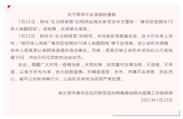 1月22日,網(wǎng)名為“東北阿森哥”的網(wǎng)民,未經(jīng)核實(shí)信息真實(shí)性,在今日頭條上發(fā)布:“絕對驚人消息”“香坊區(qū)檢測出70多人核酸陽性”等不實(shí)信息。經(jīng)公安機(jī)關(guān)調(diào)查,發(fā)布人吳某承認(rèn)其網(wǎng)絡(luò)造謠的違法事實(shí)。目前,吳某已被公安機(jī)關(guān)依法處以行政拘留10日,并處500元罰款的治安處罰。