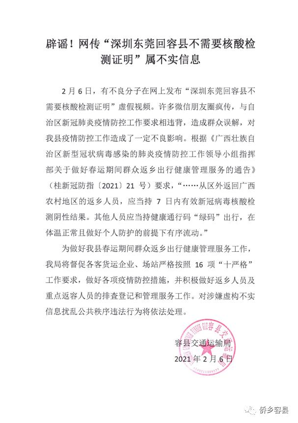 2月6日,有不良分子在網(wǎng)上發(fā)布 “深圳東莞回容縣不需要核酸檢測證明”虛假視頻。許多微信朋友圈瘋傳,與自治區(qū)新冠肺炎疫情防控工作要求相違背,造成群眾誤解,對容縣疫情防控工作造成了一定不良影響。