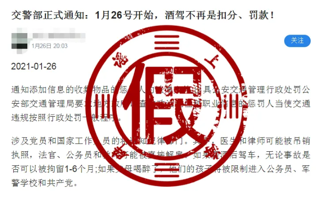 近日,有傳言稱,“1月26號開始,酒駕不再只是扣分、罰款,言下之意可能面臨更多處罰。醫(yī)生和律師可能被吊銷執(zhí)照;法官、公務(wù)員和教師可能被直接解雇;如果父母酒駕,孩子將被限制進(jìn)入公務(wù)員系統(tǒng)、軍警學(xué)校和入黨。”