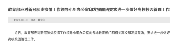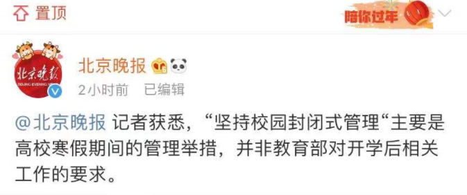 而后,北京晚報(bào)報(bào)道稱:“堅(jiān)持校園封閉式管理”主要是高校寒假期間的管理舉措,并非教育部對(duì)開學(xué)后相關(guān)工作的要求。
