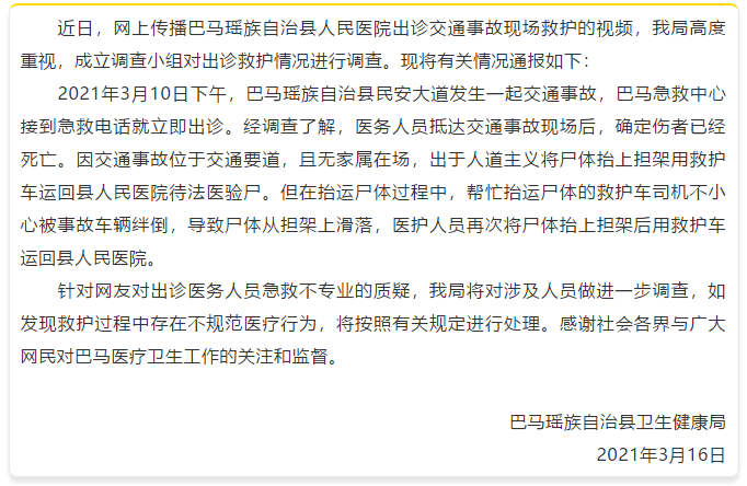 3月17日零時(shí)許,巴馬瑤族自治縣衛(wèi)生健康局通過當(dāng)?shù)毓俜轿⑿殴娞枴敖袢瞻婉R”發(fā)文回應(yīng):醫(yī)務(wù)人員抵達(dá)交通事故現(xiàn)場后,確定傷者已死亡。出于人道主義將尸體抬上擔(dān)架用救護(hù)車運(yùn)回縣人民醫(yī)院待法醫(yī)驗(yàn)尸;將對涉及人員做進(jìn)一步調(diào)查。