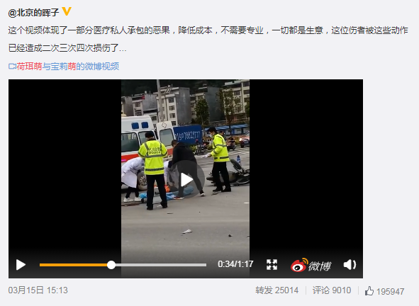 值得指出的是,話題升溫的第二個關鍵因素在于“私人承包”的說法。在輿情發(fā)酵早期,@荷珥萌與寶莉萌 在與網友互動時稱,某地救護車資源沒幾個專業(yè)人員,由私人承包。該微博被大量轉發(fā)后,許多網友質疑救護人員的做法,而出于對公立醫(yī)院的信任,推測救護車為“私人承包”。15日,超過55萬粉絲的認證博主@北京的暉子 轉發(fā)該視頻時評論:這個視頻體現(xiàn)了一部分醫(yī)療私人承包的惡果,降低成本,不需要專業(yè),一切都是生意。該條博文獲得了2萬5千余次轉發(fā)和超過19萬點贊,傳播力不容小覷。