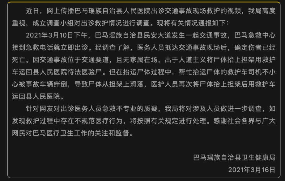 官方在3月17日才對外作出回應,巴馬瑤族自治縣衛(wèi)生健康局通過微信公眾號“今日巴馬”發(fā)布通報回應稱,醫(yī)務人員抵達交通事故現(xiàn)場后,確定傷者已經死亡。針對網友對出診醫(yī)務人員急救不專業(yè)的質疑,該局稱將對涉及人員做進一步調查,如發(fā)現(xiàn)救護過程中存在不規(guī)范醫(yī)療行為,會按照有關規(guī)定進行處理。