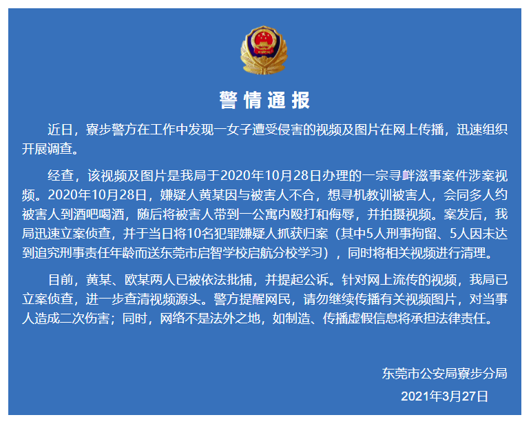 27日,廣東東莞市公安局寮步分局發(fā)聲,稱網(wǎng)傳視頻及圖片是該局于2020年10月28日辦理的一宗尋釁滋事案件涉案視頻。