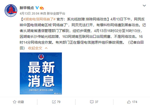 4月13日下午,網(wǎng)民反映中國(guó)電信湖南區(qū)域“網(wǎng)絡(luò)崩了”,網(wǎng)頁(yè)無(wú)法打開,有爆料稱網(wǎng)絡(luò)遭到黑客攻擊。新華社記者從湖南省通信管理部門了解到,經(jīng)初步調(diào)查,4月13日16時(shí)02分至16時(shí)13分,因湖南長(zhǎng)沙傳輸光纜故障,163網(wǎng)湖南互聯(lián)網(wǎng)出口出現(xiàn)擁塞,不是網(wǎng)絡(luò)攻擊。16時(shí)14分網(wǎng)絡(luò)完全恢復(fù)。有關(guān)部門正在督促電信溯源并組織事故調(diào)查。