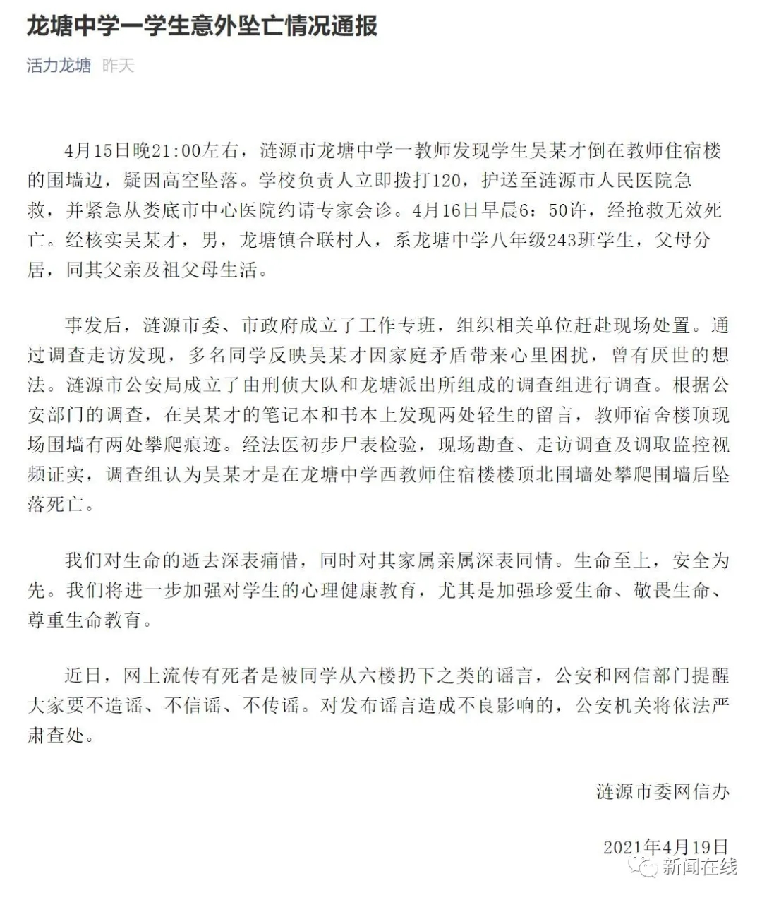 4月19日,漣源市委網(wǎng)信辦就此事發(fā)布通報(bào),稱有多名同學(xué)反映,吳某才有輕生跡象,此外還在吳某才的筆記本和書本上發(fā)現(xiàn)兩處輕生的留言。