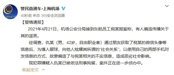 上海市公安局國(guó)際機(jī)場(chǎng)分局官方微博4月24日通報(bào),2021年4月21日,機(jī)場(chǎng)公安分局接到東航員工倪某報(bào)案稱,有人編造傳播關(guān)于其的謠言。
