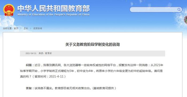 問題:近日,我看到騰訊網(wǎng)、各大瀏覽器等一些較有權(quán)威性的網(wǎng)絡(luò)平臺,頻繁發(fā)布這樣一則消息:從2021年秋季學(xué)期開始,小學(xué)學(xué)制將正式縮短為5年,初中變?yōu)?年,將原來小學(xué)的六年級變更為初中的起始年級。請問是真的嗎?