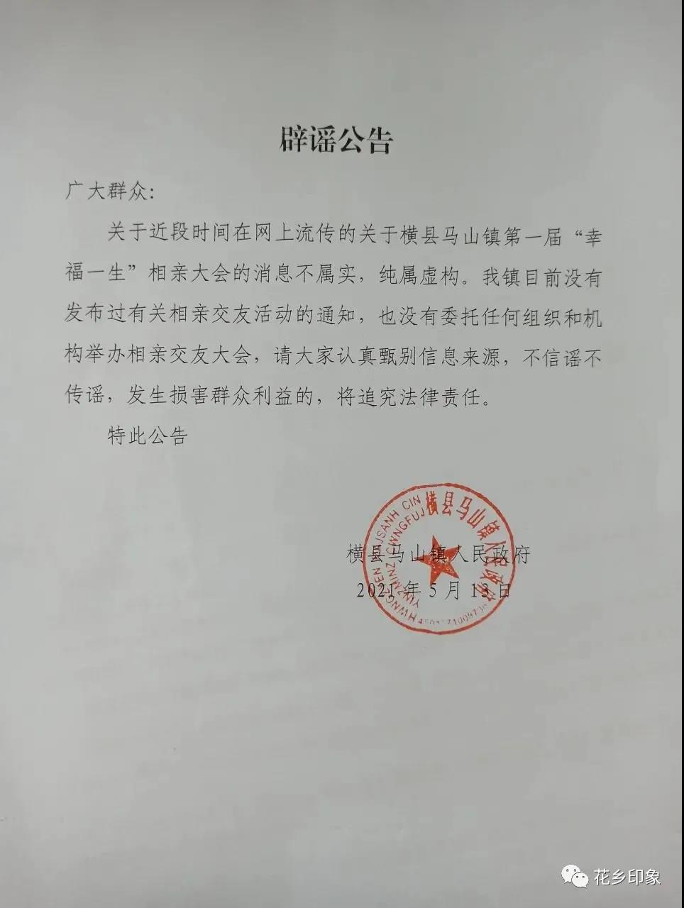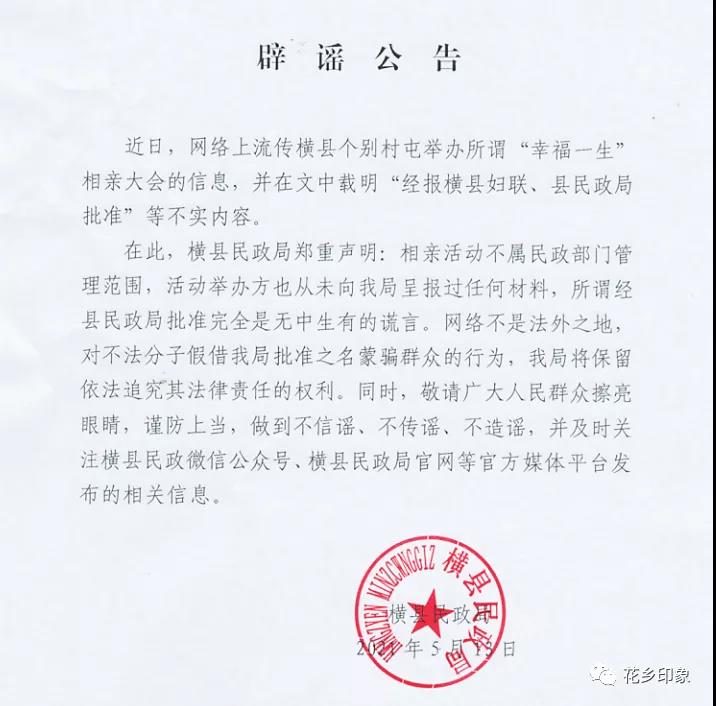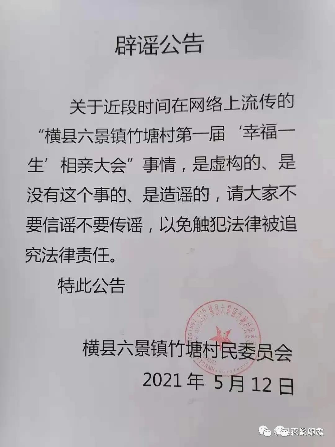 近日,兩則消息在橫縣人的朋友圈里廣泛流傳:橫縣六景鎮(zhèn)竹塘村要舉行第一屆“幸福一生”相親大會(huì);橫縣馬山鎮(zhèn)要舉行第一屆“幸福一生”相親大會(huì)。經(jīng)核實(shí),這消息是假的!是謠言!沒有相親大會(huì)!