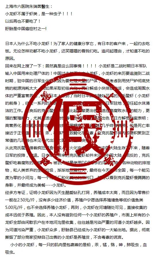 該貼文將歷年關(guān)于小龍蝦的謠言匯集到一起,再冠上上海六院朱瑞茵醫(yī)生的名號(hào)大肆傳播,小龍蝦表示“背不了這么多鍋”!