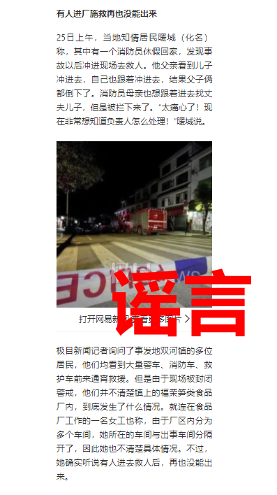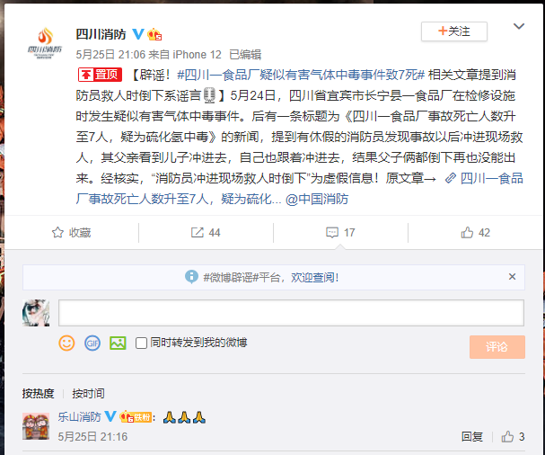 5月25日 21:06@四川消防 微博帳號(hào)發(fā)布辟謠:5月24日,四川省宜賓市長(zhǎng)寧縣一食品廠在檢修設(shè)施時(shí)發(fā)生疑似有害氣體中毒事件。后有一條標(biāo)題為《四川一食品廠事故死亡人數(shù)升至7人,疑為硫化氫中毒》的新聞,提到有休假的消防員發(fā)現(xiàn)事故以后沖進(jìn)現(xiàn)場(chǎng)救人,其父親看到兒子沖進(jìn)去,自己也跟著沖進(jìn)去,結(jié)果父子倆都倒下再也沒(méi)能出來(lái)。經(jīng)核實(shí),“消防員沖進(jìn)現(xiàn)場(chǎng)救人時(shí)倒下”為虛假信息!