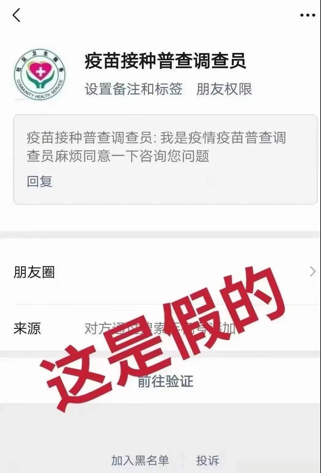 近期,有市民反映稱,接到自稱是“疫苗接種普查調(diào)查員”的好友申請(qǐng),對(duì)此,警方提醒該信息是假的!遇到請(qǐng)直接拉黑刪除!