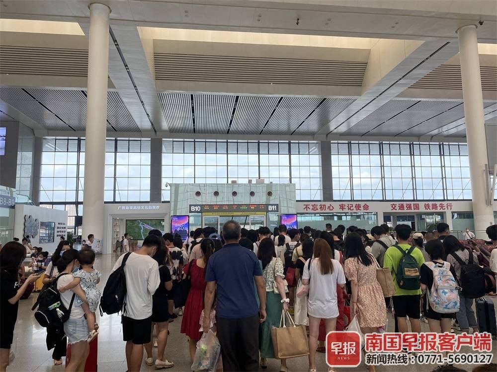 ▲南寧東站內(nèi),排隊(duì)準(zhǔn)備進(jìn)站的旅客們。南國早報(bào)客戶端記者 李藝攝