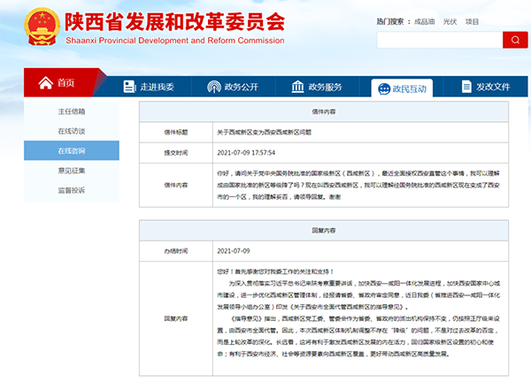 7月9日,陜西省發(fā)改委官方網(wǎng)站“在線咨詢”欄目刊發(fā)了一則網(wǎng)友留言稱:“請問關(guān)于黨中央國務(wù)院批準(zhǔn)的國家級新區(qū)(西咸新區(qū)),最近全面授權(quán)西安直管這個事情,我可以理解成由國家批準(zhǔn)的新區(qū)等級降了嗎?”在這名網(wǎng)友看來,西咸新區(qū)“現(xiàn)在變成了西安市的一個區(qū)”。