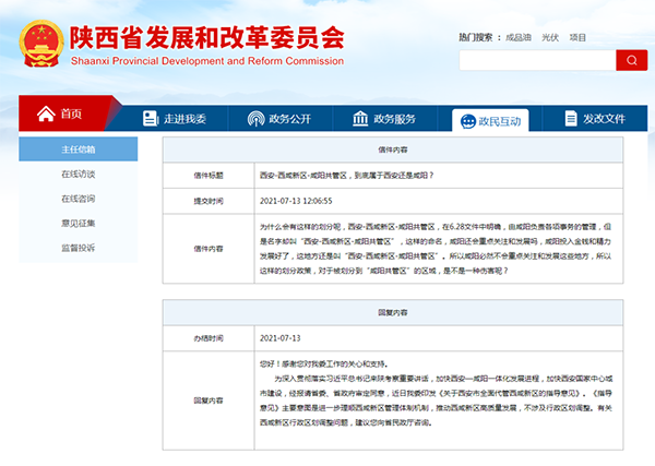 此外,陜西省發(fā)改委在7月13日答復(fù)網(wǎng)友關(guān)于“西安-西咸新區(qū)-咸陽共管區(qū),到底屬于西安還是咸陽?”的詢問時強(qiáng)調(diào),《關(guān)于西安市全面代管西咸新區(qū)的指導(dǎo)意見》主要意圖是進(jìn)一步理順西咸新區(qū)管理體制機(jī)制,推動西咸新區(qū)高質(zhì)量發(fā)展,不涉及行政區(qū)劃調(diào)整。