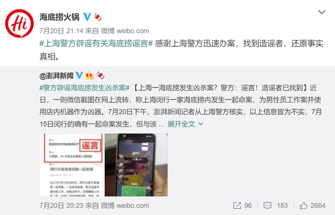 據某自媒體消息,海底撈回應稱:案件與我司無任何關系,我們已關注到網絡上相關謠言,并已要求造謠傳謠者盡快刪除相關不實言論,我司將依法追究惡意造謠者法律責任。門店已經在7月18日就網絡謠言向轄區(qū)派出所報案,警方正在依法調查。