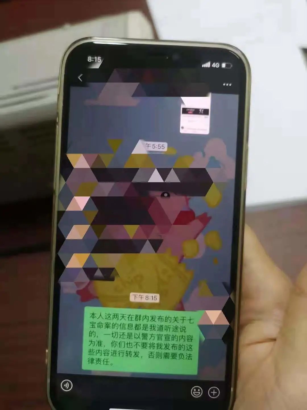 該造謠者寫道:“本人這兩天在群內發(fā)布的關于七寶命案的信息都是我道聽途說的,一切還是以警方官宣的內容為準,你們也不要將我發(fā)布的這些內容進行轉發(fā),否則需負法律責任。”