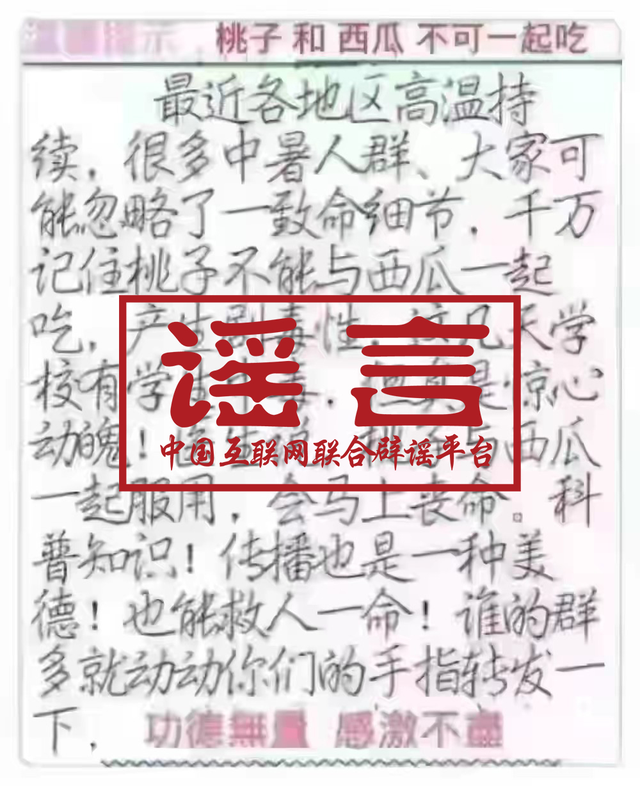隨著夏季到來,西瓜上市,一則陳年舊謠又開始在網(wǎng)上流傳。謠言稱,西瓜和桃子一起吃會產(chǎn)生劇毒。