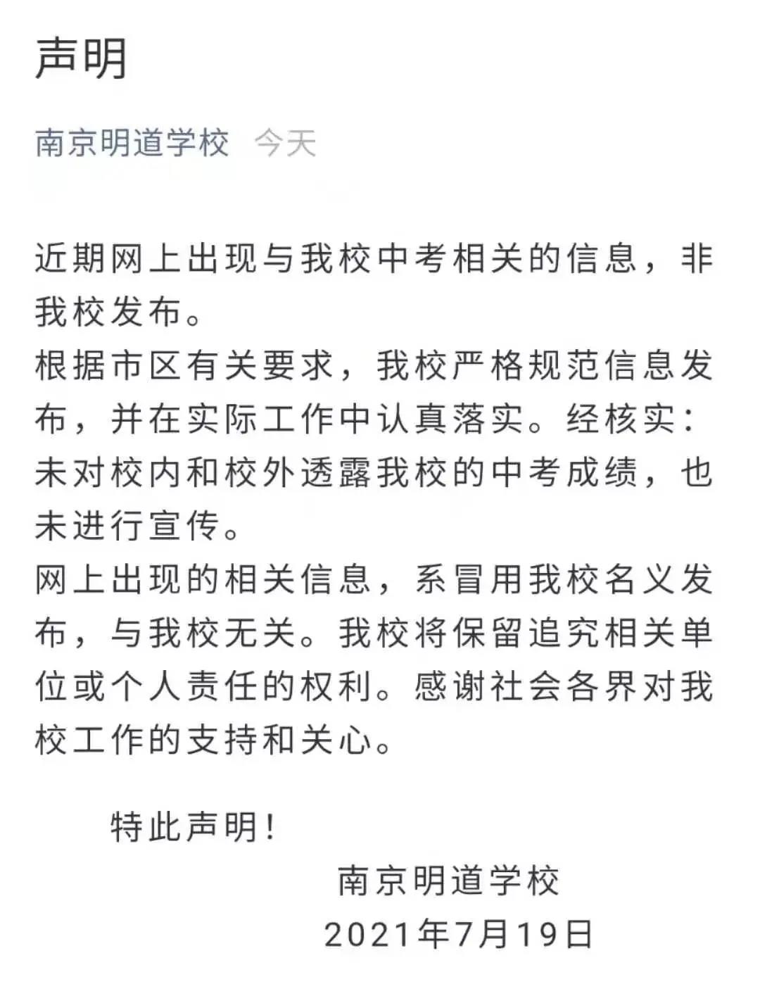 2021年中招錄取工作正在進行中,南京一些家長群中傳出部分學(xué)校中考成績的數(shù)據(jù)。7月19日,南京市明道中學(xué)官方微信發(fā)布聲明,表示近期網(wǎng)絡(luò)出現(xiàn)的中考相關(guān)消息并非官方發(fā)布。聲明中強調(diào),學(xué)校嚴(yán)格規(guī)范信息發(fā)布,未對校內(nèi)和校外透露學(xué)校中考成績,也未進行宣傳。網(wǎng)絡(luò)上出現(xiàn)的相關(guān)信息,系冒用學(xué)校名義發(fā)布。無獨有偶,早前南京市二十九中柳州東路分校也發(fā)布過類似聲明,表達相同聲音。
