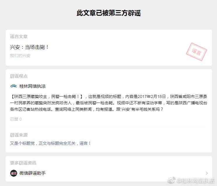 微信公眾號【我們的興安】7月5日發(fā)布謠言信息【興安:當場擊斃!】,桂林網(wǎng)信辦予以辟謠。