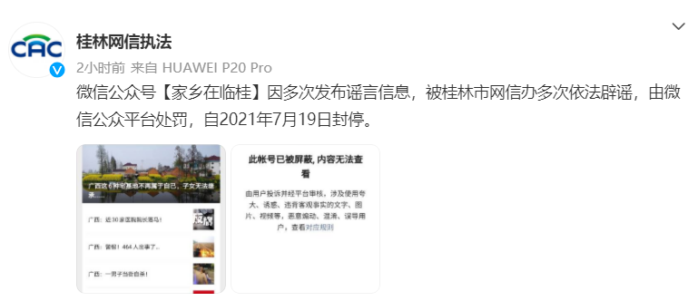 微信公眾號“家鄉(xiāng)在臨桂”因多次發(fā)布謠言信息,被桂林市網(wǎng)信辦多次依法辟謠,由微信公眾平臺處罰,自2021年7月19日封停。