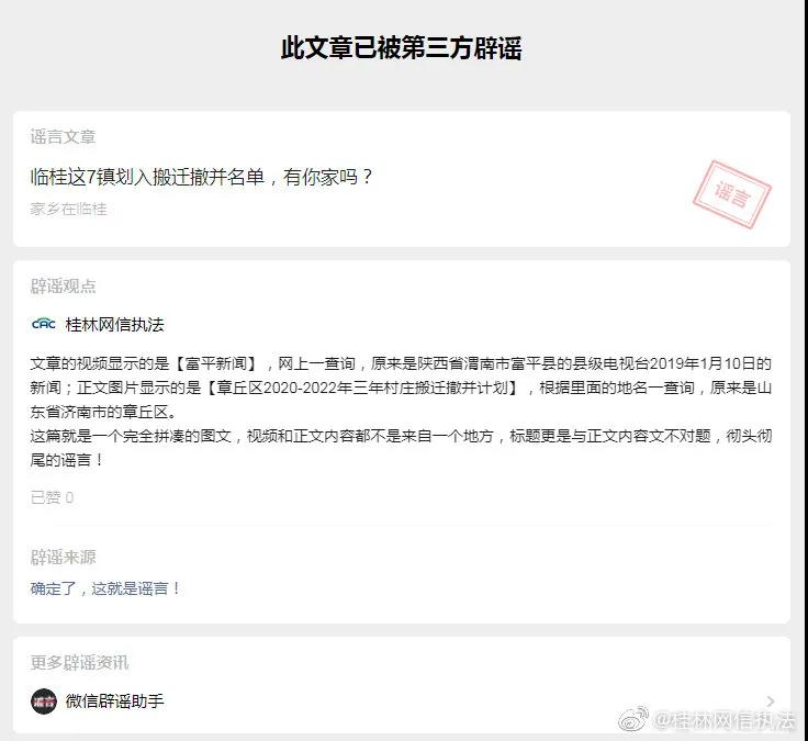 微信公眾號【家鄉(xiāng)在臨桂】7月14日發(fā)布謠言信息【臨桂這7鎮(zhèn)劃入搬遷撤并名單,有你家嗎?】,桂林網(wǎng)信辦予以辟謠。