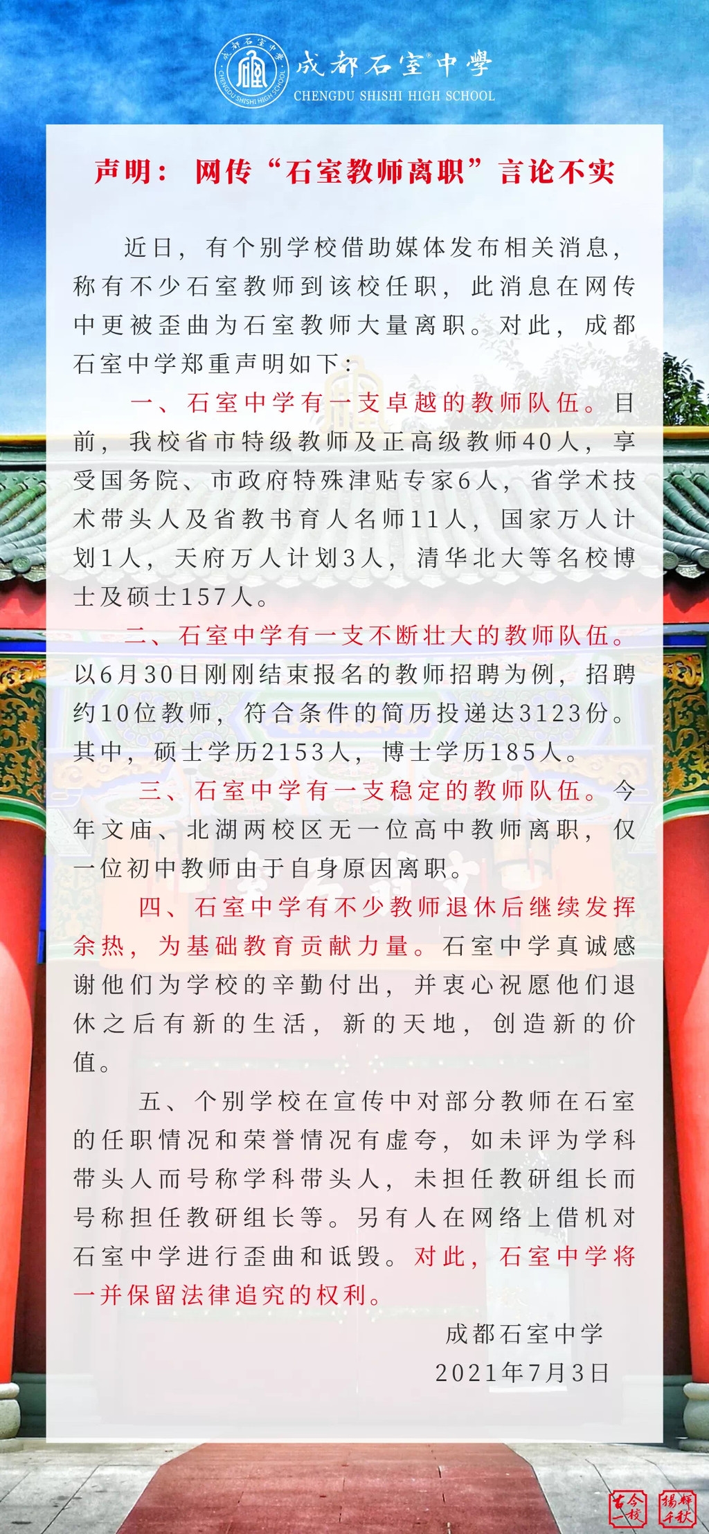 近日,有個別學(xué)校借助媒體發(fā)布消息,稱有不少石室教師到該校任職,此消息在網(wǎng)傳中被歪曲為石室教師大量離職,對此,成都石室中學(xué)7月3日回應(yīng):言論不實。
